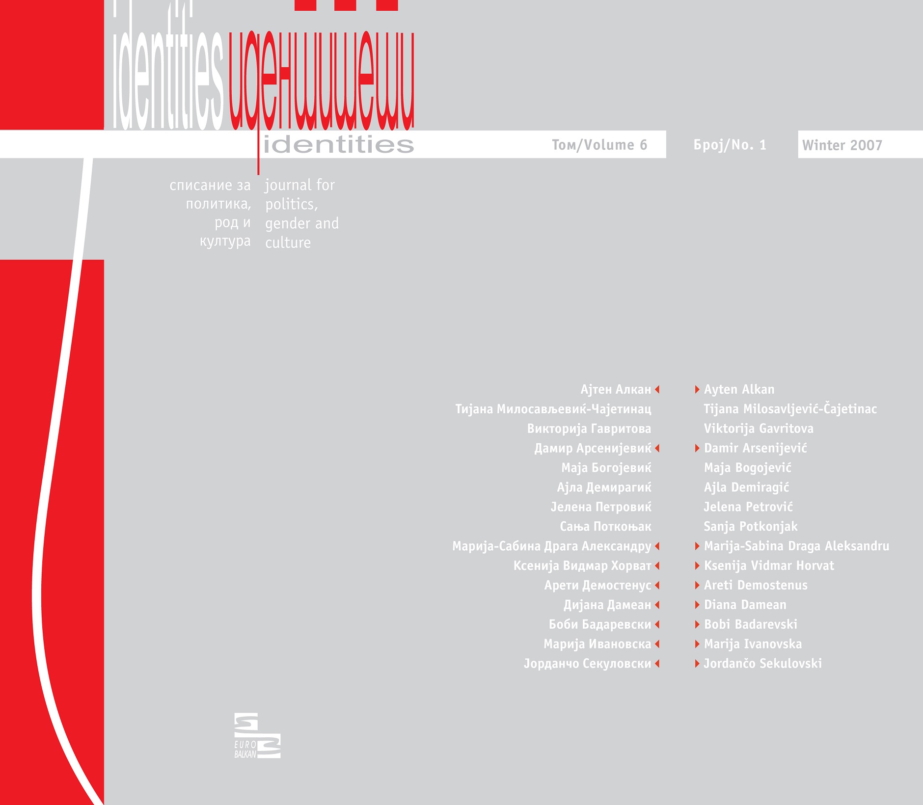 The three texts published in the first part of this number of Identities are products of research teams that were established in the framework of the Regional Seminar in Gender/Women’s Studies and European Studies 2004-2006, a three-year project organized by the Research Center in Gender Studies and supported by HESP. The main aim of the Seminar was to establish a regional floor for scholarly investigation into the points of regional specificity regarding the critical theoretical/scientific questions mapping the research needs of SEE in the field of gender/women’s studies and situating these points of specificity into the wider context of the European theoretical legacy. The reseach teams, consisted of young faculty from the region of SEE have been working together for several years in the course of the project, peer-monitoring each other's development and jointly attending three Summer and three Winter session.